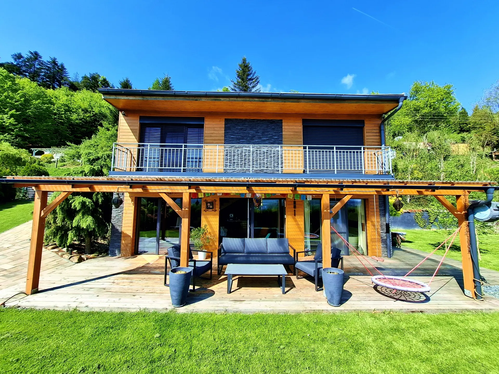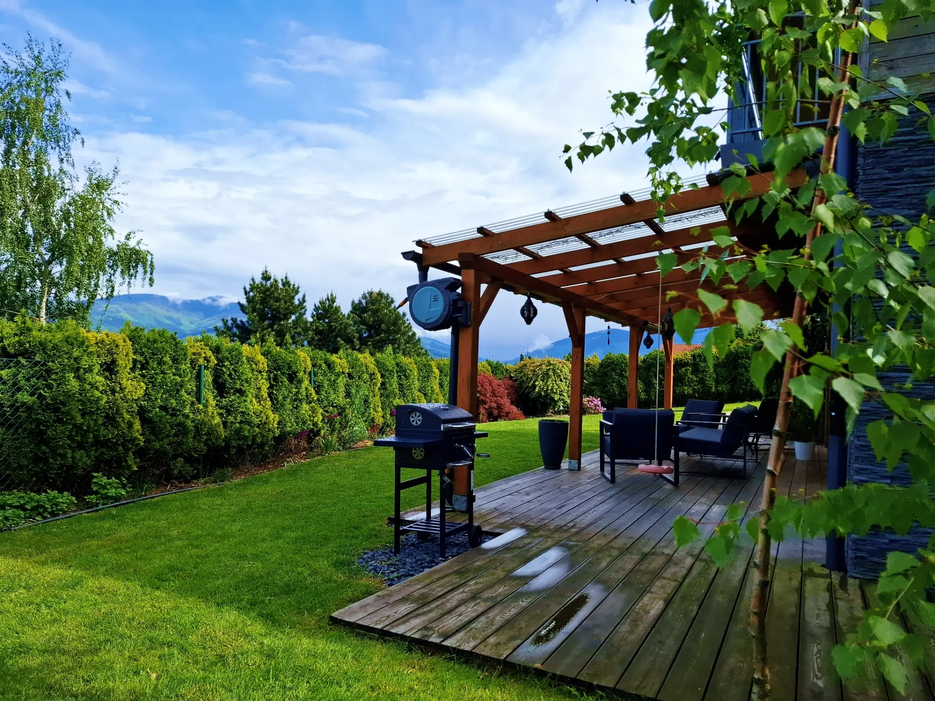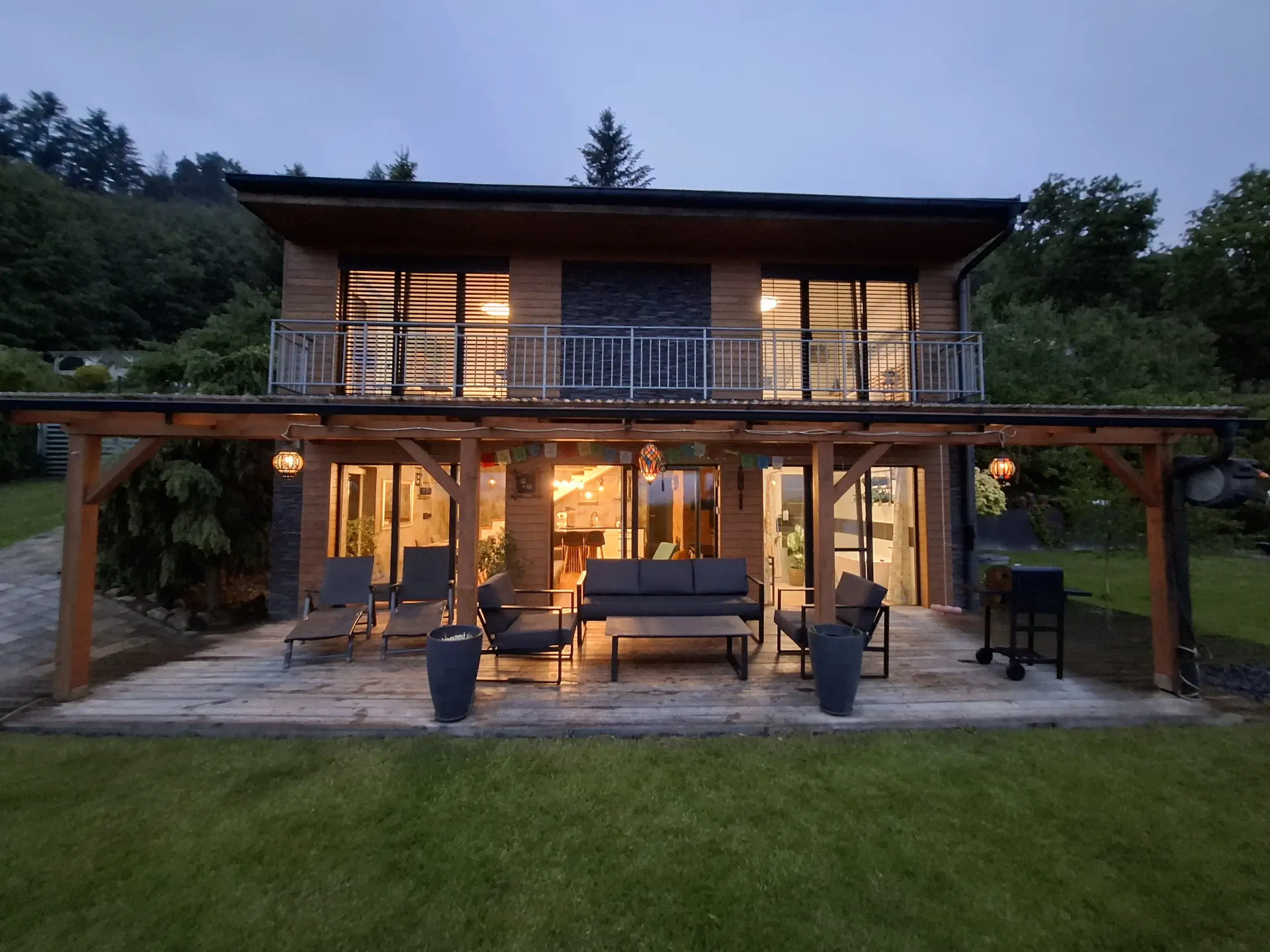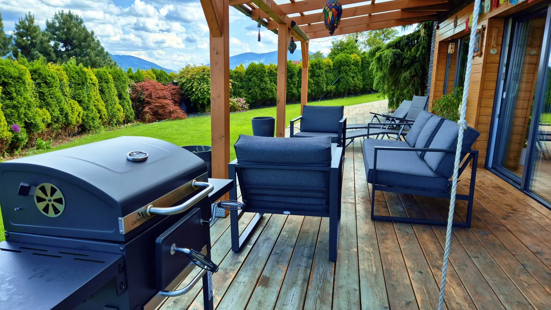 Krytá terasa s posezením: Místo pro vaši ranní kávu s výhledem na hory, odpolední čtení ve stínu nebo večerní sdílení zážitků s přáteli.