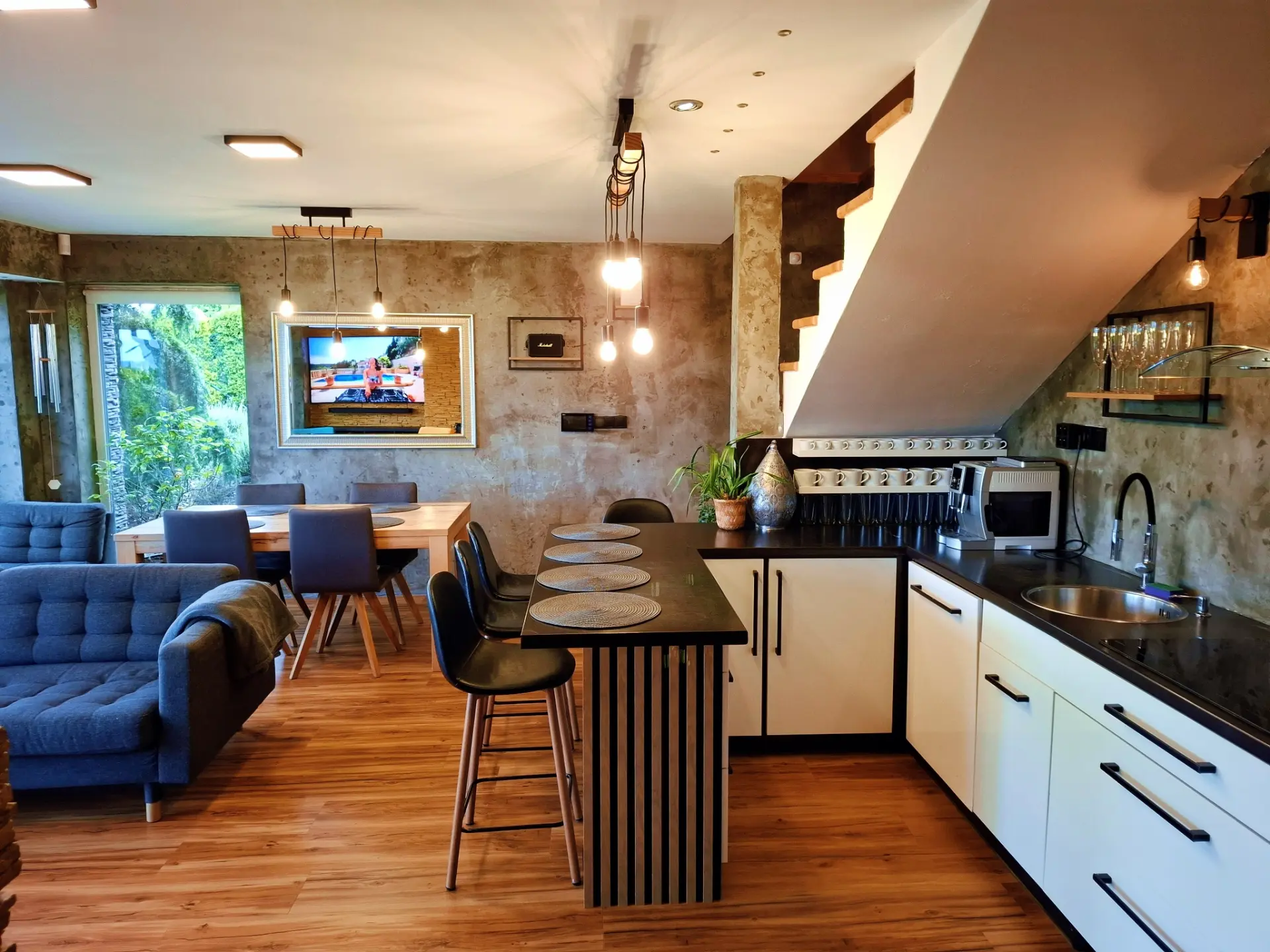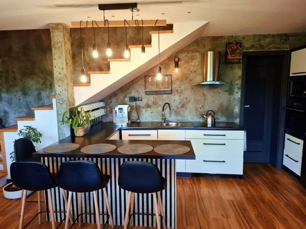 Kuchyň s obývacím pokojem: Plně vybavený prostor, kde si můžete naplno užít společné stolování i odpočinek u hřejivého krbu. K dispozici je kávovar DeLonghi na zrnkovou kávu, která vám zpříjemní každé ráno. Speciálně pro vás máme připravenou 125g espresso směs z lokální pražírny UPRAŽENO.