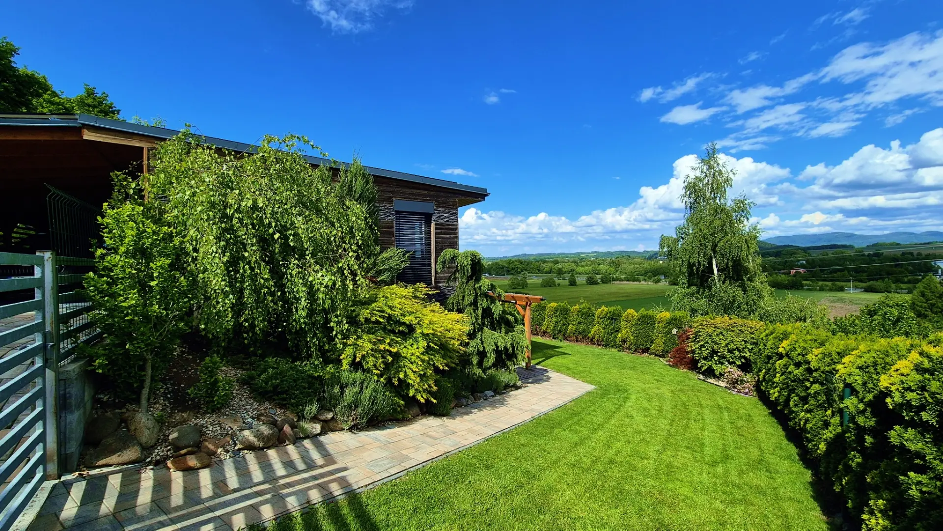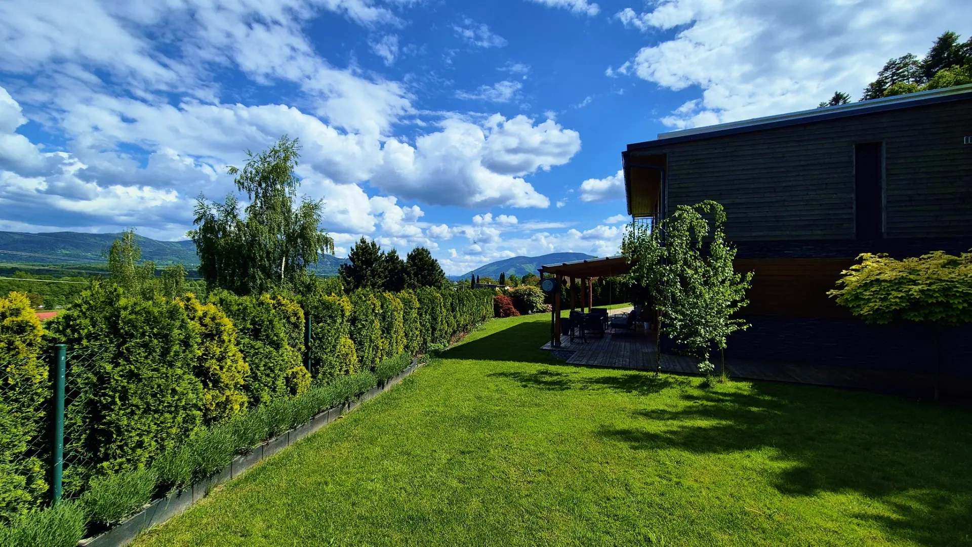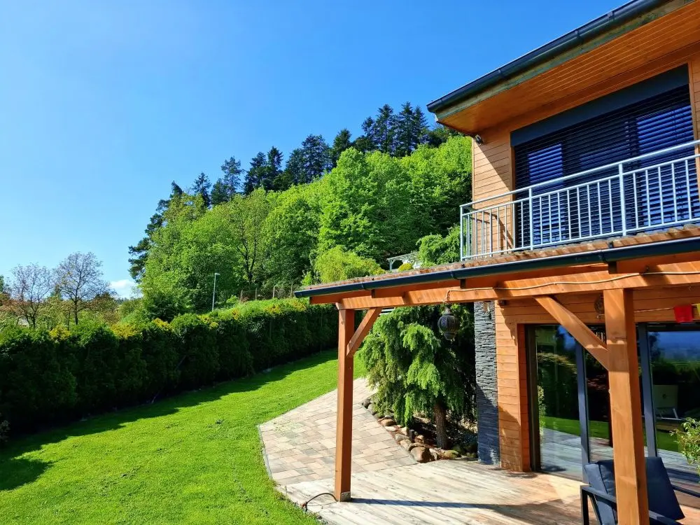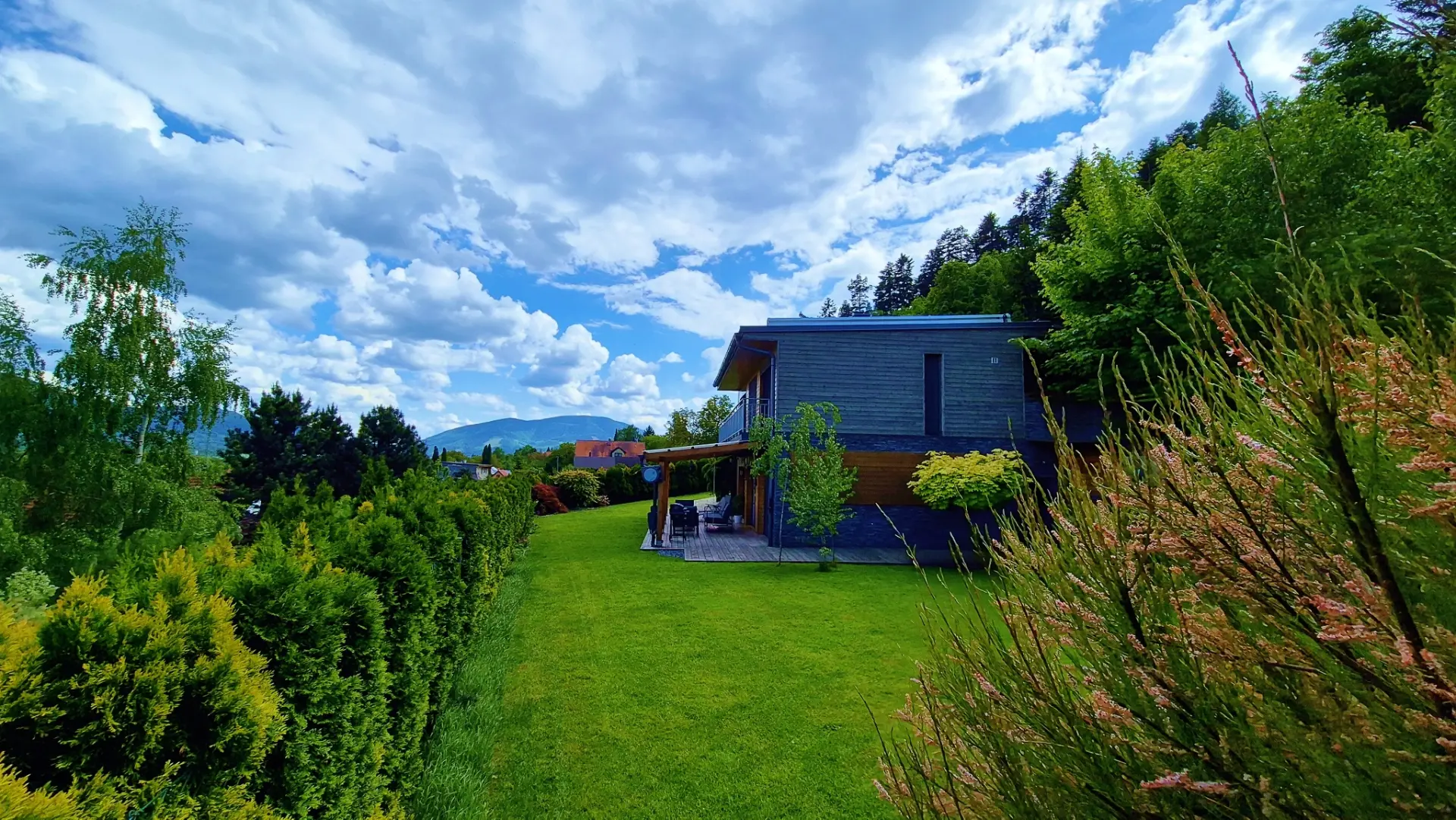 Dům je navržen tak, aby vás propojil s přírodou. Díky proskleným stěnám v obývacím pokoji i ložnici máte panorama Beskyd a dominantní Lysou horu jako na dlani přímo z postele nebo od venkovního posezení.