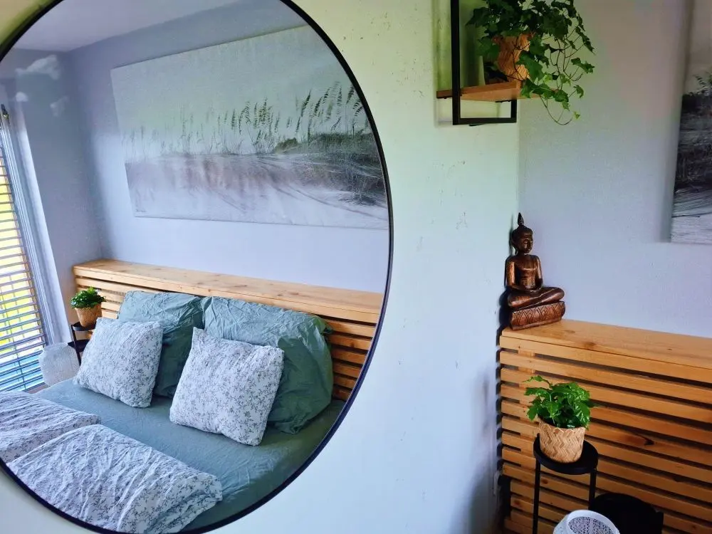 Zahrada: Zenovna je obklopena oplocenou zahradou, kde můžete vnímat přírodu, projít se bosky po trávě nebo jen tak pozorovat proměny světla během dne. Pro ty nejmenší je tu připravená houpačka, odrážedlo a venkovní mini kuchyňka.