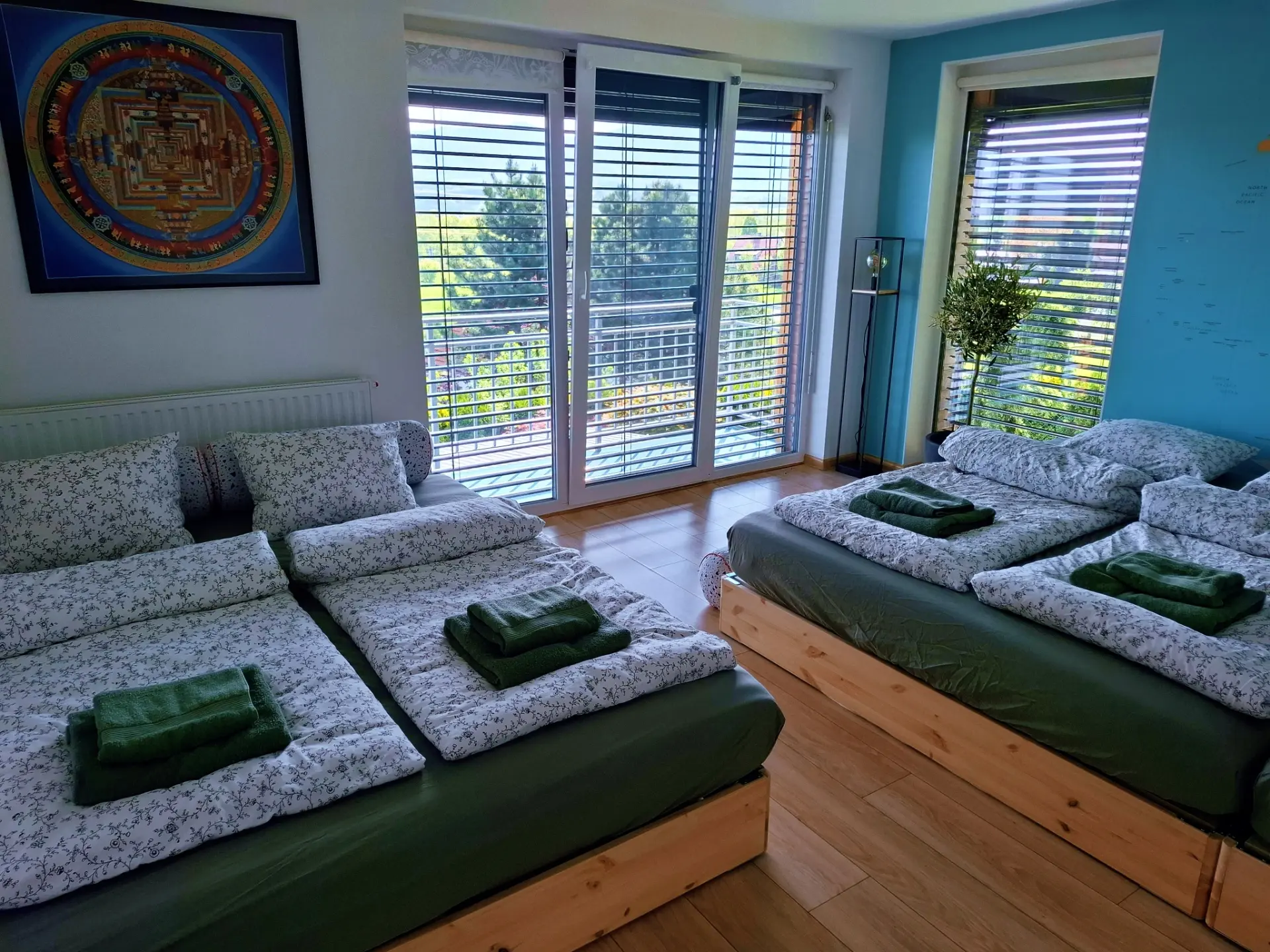 Pokoj: prostorný se třemi manželskými postelemi pro rodinu či skupiny.